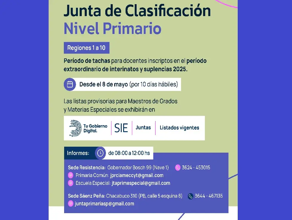 Para mayor información: Junta de Clasificación Nivel Primario Sede Resistencia: Gobernador Bosch N° 99, Nave 1, en el horario de 8 a 12; correos: Primaria Común, jprciameccyt@gmail.com, Escuela Especial: jtaprimespecial@gmail.com. Teléfono: 3624-453015