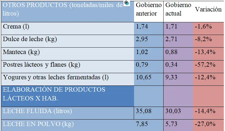 Al comparar la producción acumulada por habitante de algunos productos elaborados por la industria láctea local durante los primeros 15 meses de gestión de los presidentes Alberto Fernández y Javier Milei, el contexto del primero era de pandemia y el del Gobierno actual es el de políticas de shock al inicio de gestión.
