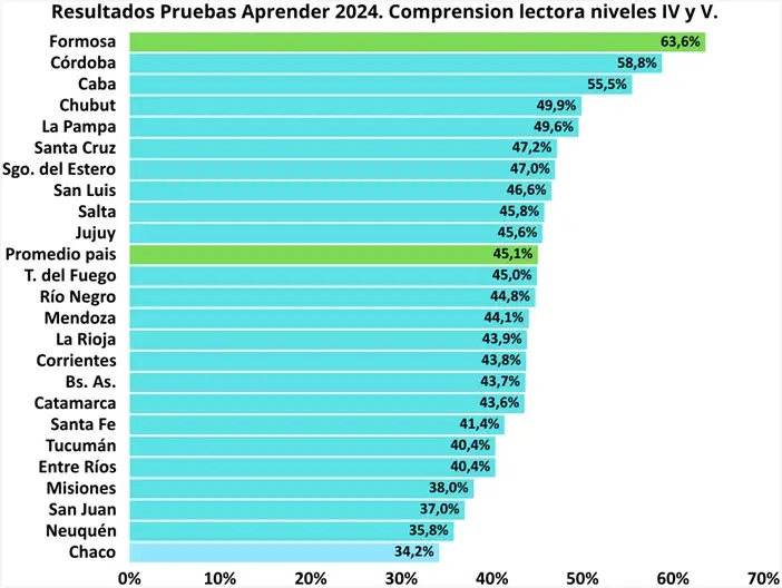 Desde la consultora Politiké explicaron que las Pruebas Aprender son evaluaciones nacionales que se toman en las escuelas de todo el país para conocer cuánto aprendieron los estudiantes en comprensión lectora. Al analizar los resultados obtenidos durante el año 2024 para la combinación de las categorías de nivel IV (comprende textos de forma literal, inferencial y reflexiva) y de nivel V (comprende textos de forma literal, inferencial, reflexiva y establece inferencias complejas), en la comprensión de lectura por parte de los alumnos, se pudo observar que las provincias con mejores desempeños fueron Formosa, donde el 63,6% de los alumnos comprenden lo que leen, Córdoba con un 58,8% y la Ciudad Autónoma de Buenos Aires (CABA) con un 55,5%.