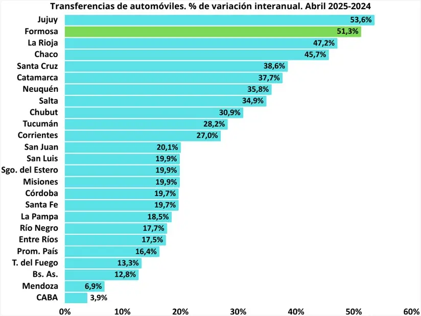 En otro ámbito, refirieron que en el mes de abril del 2025 las transferencias de autos en la provincia de Formosa aumentaron un 51,3% en lo que respecta a su comparación interanual, superando ampliamente el 16,4% a nivel nacional para el mismo periodo de tiempo.