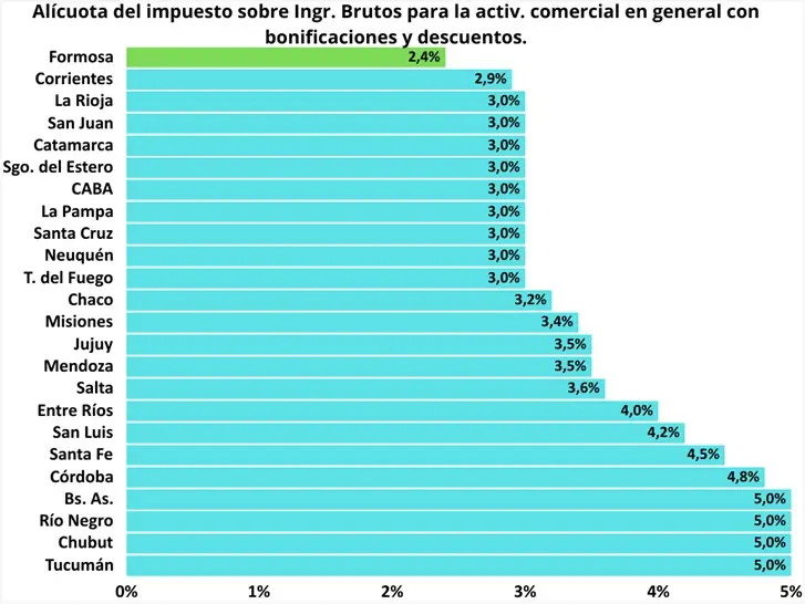 La alícuota es el porcentaje que se aplica para calcular cuánto deben pagar las personas o empresas en concepto de impuesto sobre los ingresos brutos. La consultora se enfocó específicamente en la actividad comercial en general y realizó un relevamiento sobre las alícuotas del impuesto sobre ingresos brutos para esta categoría de cada una de las provincias de Argentina, consignando que la jurisdicción formoseña cobra una alícuota en el orden del 3%.