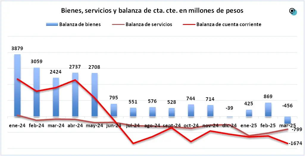 Un dato significativo es que en marzo de 2024 la balanza de bienes arrojó un preocupante saldo negativo de 456 millones de dólares.