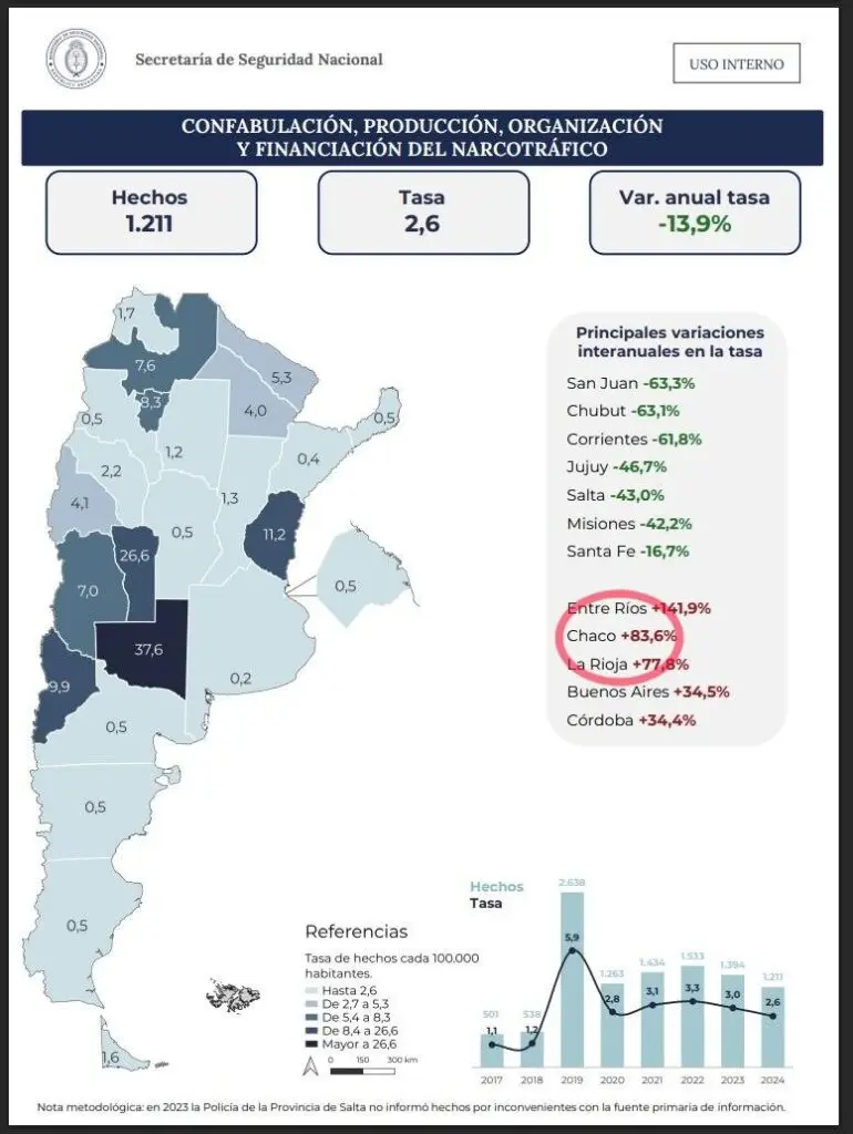 No solo los homicidios preocupan, se advierte que el mismo informe de la ministra Patricia Bullrich revela un “creciente financiamiento narco en el Chaco” que, según fuentes provinciales, estaría infiltrándose en distintos sectores públicos.
