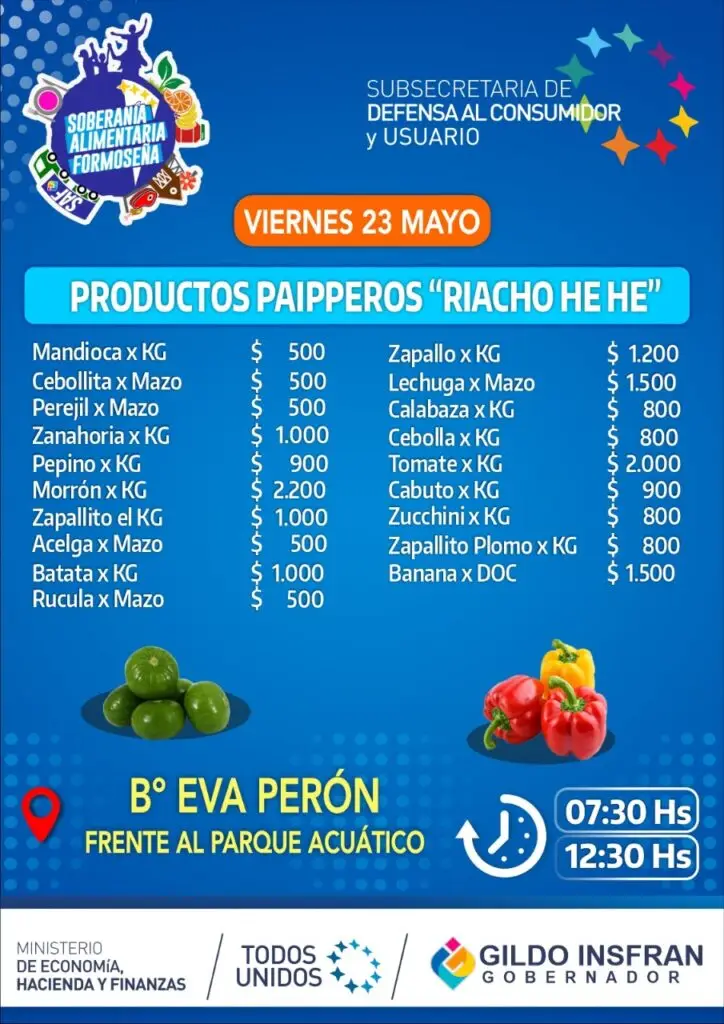 El programa Soberanía Alimentaria Formoseña trasladará este viernes 23 su logística al barrio Eva Perón, frente al Parque Acuático “17 de Octubre”, al mismo tiempo que abrirá las puertas del local comercial ubicado en Avenida Néstor Kirchner 1855, de manera que se dispondrá de los listados completos de alimentos en ambas jornadas.
