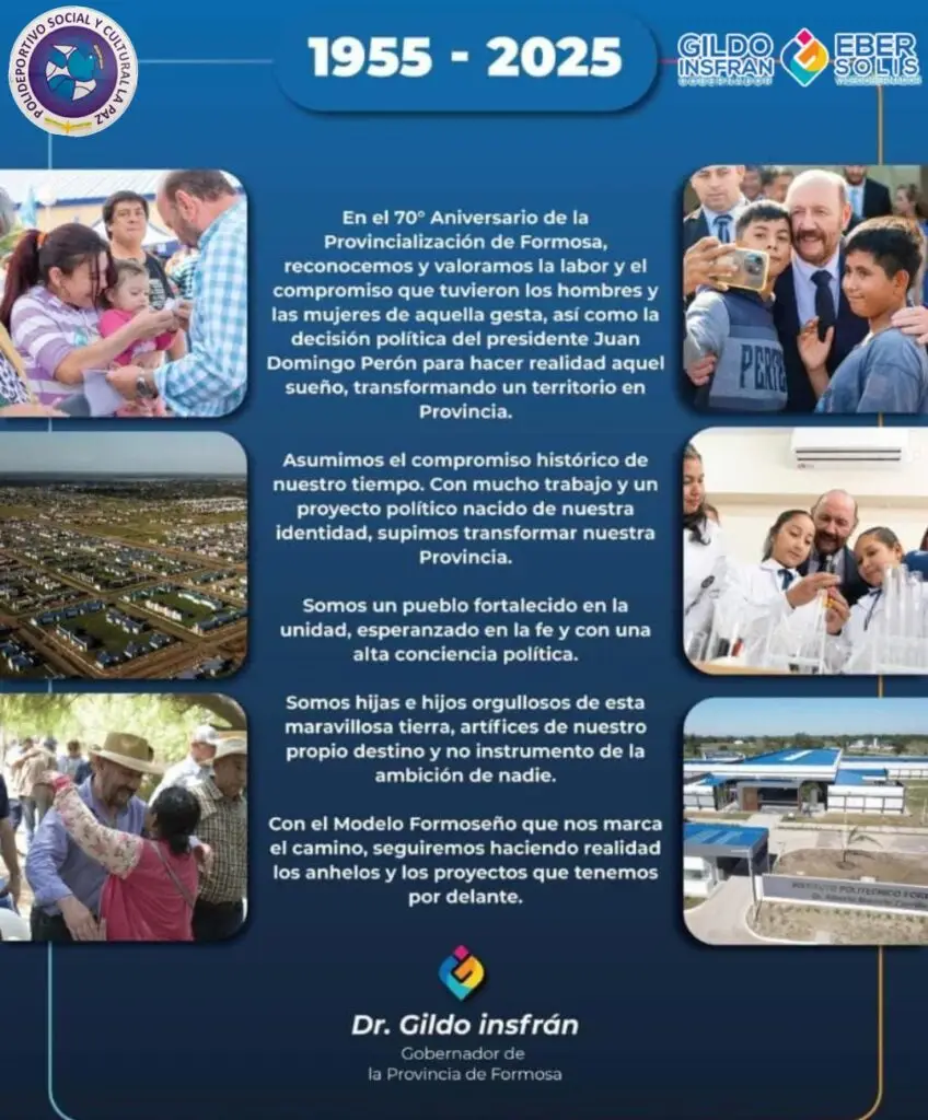 Insfrán subrayó que aquella gesta “reconoció la madurez política y la identidad de un pueblo fortalecido en la unidad y la fe”, y resaltó la decisión de Perón de “hacer realidad el sueño de transformar un territorio en provincia”. A su juicio, ese acto marcó el inicio de un proyecto político propio: “Con trabajo y un Modelo Formoseño, supimos transformar nuestra provincia”.