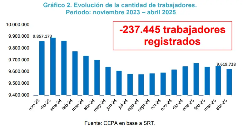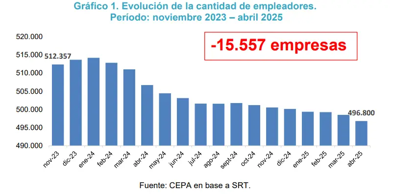 Un informe basado en información de la Superintendencia de Riesgos del Trabajo (SRT) analiza la evolución del empleo registrado y de las empresas empleadoras entre noviembre de 2023 y abril de 2025, los primeros dieciséis meses de la gestión de Javier Milei. Los datos revelan un retroceso generalizado en el mercado laboral formal: