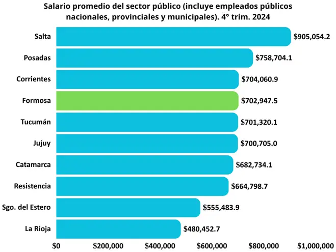 Por otra parte y teniendo en cuenta la EPH del cuarto trimestre del 2024, se analizó el salario promedio de los empleados que se desempeñan en el sector público de los aglomerados del Norte Grande de Argentina (esto incluye empleados públicos de organismos nacionales, provinciales y municipales y empleados públicos, fuerzas de seguridad, salud y docentes).