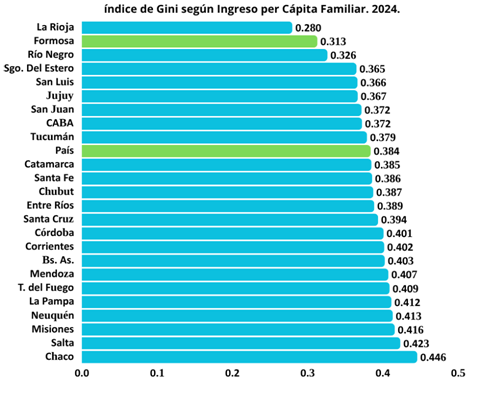 El análisis mostró que la jurisdicción de Formosa se sitúa entre las dos con menor desigualdad en el Ingreso Total Familiar a nivel nacional, primera en la región del NEA y segunda del Norte Grande. Esto significa que durante todo el 2024, en promedio, la dispersión de los ingresos familiares en Formosa es más reducida que en la mayoría de las provincias del país.