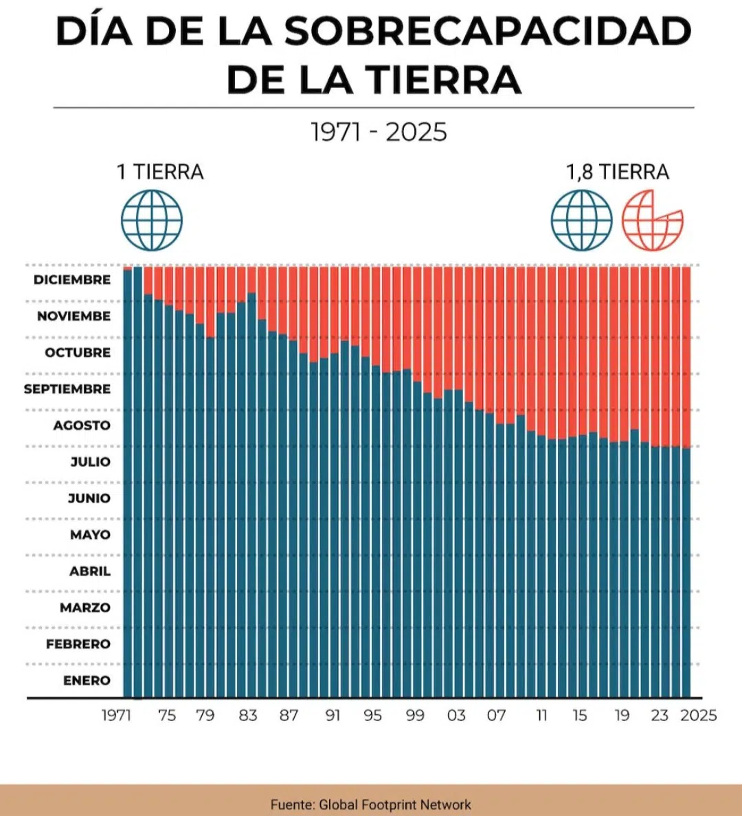El 24 de julio de 2025 agotó los recursos, ha sido designado como el Día de la Sobrecapacidad de la Tierra, un momento clave en el que la humanidad consumió todos los recursos naturales que el planeta es capaz de regenerar en un año.