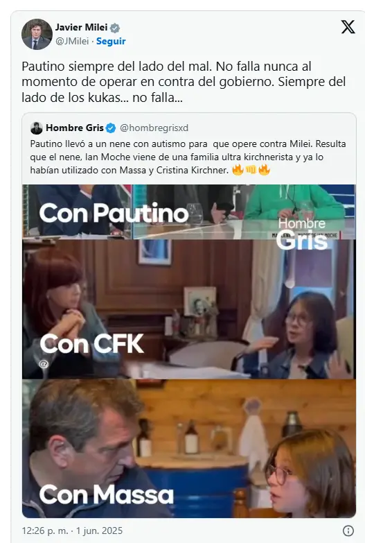 La denuncia fue pública y derivó en una fuerte discusión sobre la política oficial en materia de discapacidad. En lugar de responder sobre el fondo del reclamo, Milei compartió un mensaje de otro usuario en el que apuntó: “Pautino siempre del lado del mal. No falla nunca al momento de operar en contra del Gobierno. Siempre del lado de los kukas… no falla…”.