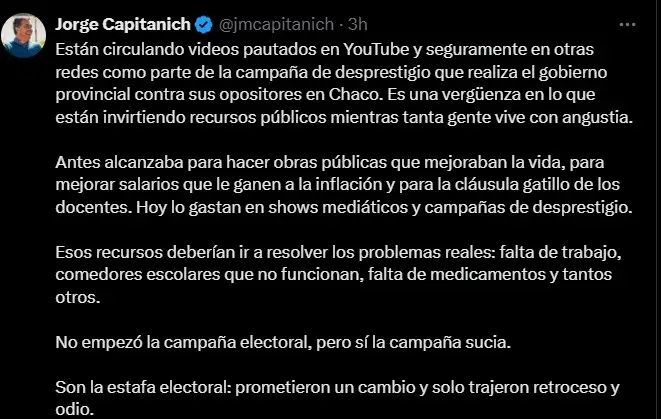 Al mismo tiempo, Jorge Capitanich salió a denunciar públicamente en sus redes la circulación de “videos pautados” —materiales en YouTube y otras plataformas que, según él, forman parte de una campaña coordinada para desprestigiar a su espacio político—, lo que suma la dimensión digital a la escalada de intimidación.
