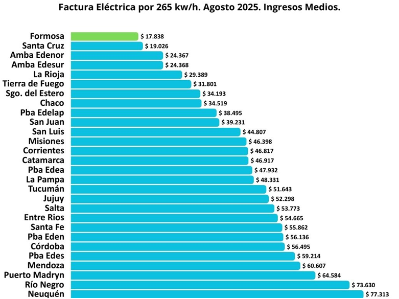 Al desglosar los datos por provincia, remarcaron que Formosa es la jurisdicción del país con la factura eléctrica más baja para niveles de ingreso medios (N3) con un valor de $17.838, mientras que para ingresos bajos (N2) es de $13.072, siendo la segunda factura eléctrica más baja del país para este nivel, a valores de agosto de 2025.