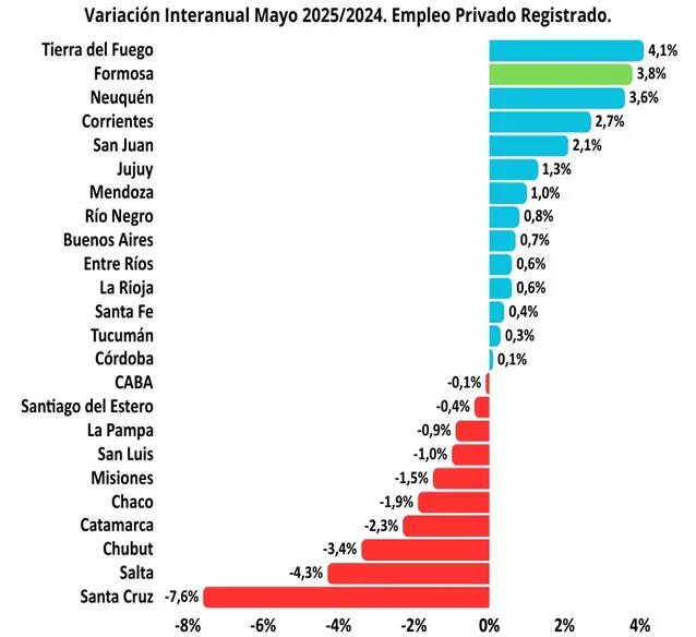 Además, refirieron que en el último informe del Ministerio de Capital Humano de la Nación se pudo visualizar que la provincia de Formosa fue la segunda jurisdicción que mejor desempeño tuvo del país en mayo del 2025 en su comparación interanual, con un aumento del trabajo registrado privado en un 3,8%, significando más de 844 nuevos puestos de trabajo registrado.
