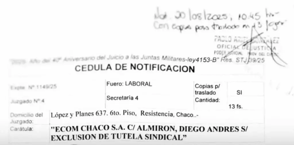 La Unión de Trabajadores de la Informática del Chaco (UTICH) afirmó que ECOM Chaco S.A. inició una presentación en la Justicia cuyo “único fin” sería despedir al secretario general del gremio. La información fue difundida este lunes 1 de septiembre por Diario NORTE. Hasta ahora, no se conocen detalles del expediente ni la carátula de la acción judicial.