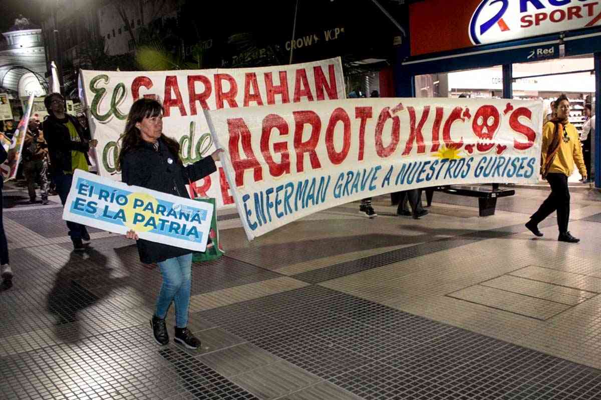 Desde el centro de la plaza se arriman otros militantes tocando tambores. Dos mujeres bajan pancartas de una camioneta. Una joven pasa por la vereda con su hijo pequeño que recién sale de la escuela. Se detiene y pregunta por qué es la convocatoria. Otra joven le explica y le extiende un volante, que ella lee e invita a leer a su hijo: “Mirá esto, qué interesante. Estos son químicos que echan en las plantas y después lo comemos, todas porquerías”, le explica. El nene mira con curiosidad los carteles, el volante, los tambores. Con una mano agarra su mochila y con la otra la mano de su mamá, que cuenta que vivió un tiempo en el periurbano de Paraná y vio de cerca el problema de las fumigaciones.