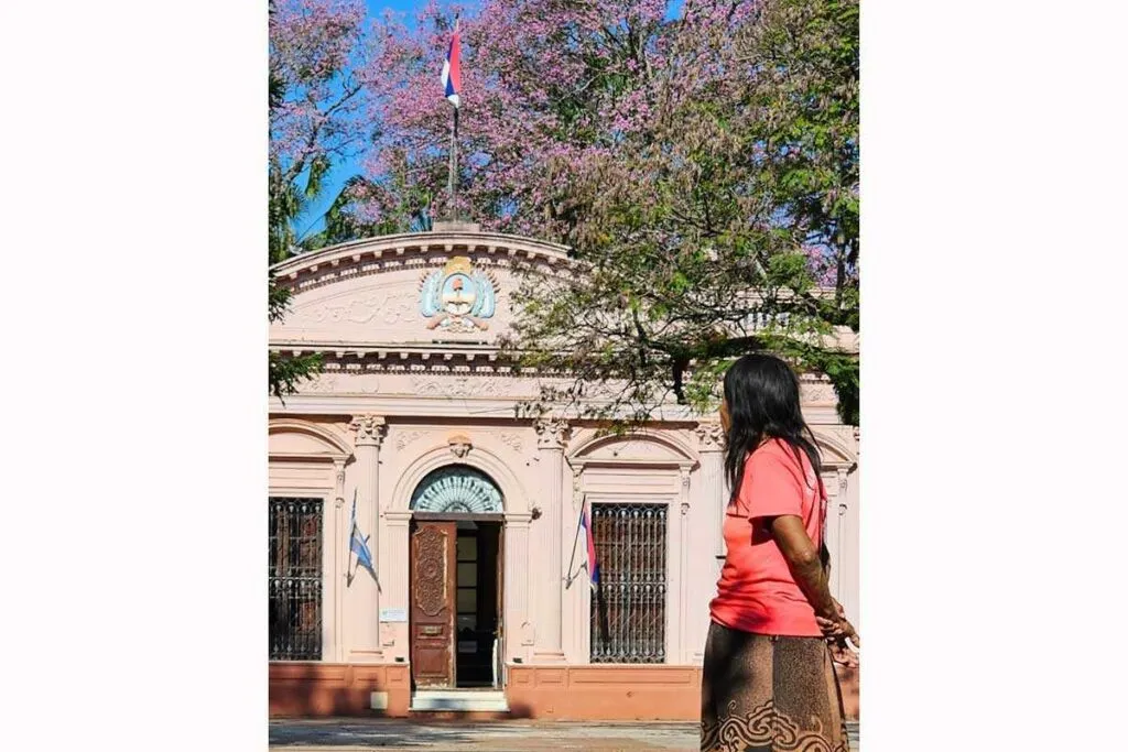 Una foto que dice mucho. De un lado, la imagen institucional de la Casa de Gobierno que representa silencio, abandono, desidia y promesas incumplidas. Del otro —representado por una mujer Mbya en actitud serena pero firme— un pueblo ancestral que resiste. Con paciencia, pero con firmeza. Que lucha por el reconocimiento de sus derechos en un sistema que se edificó negándolos.