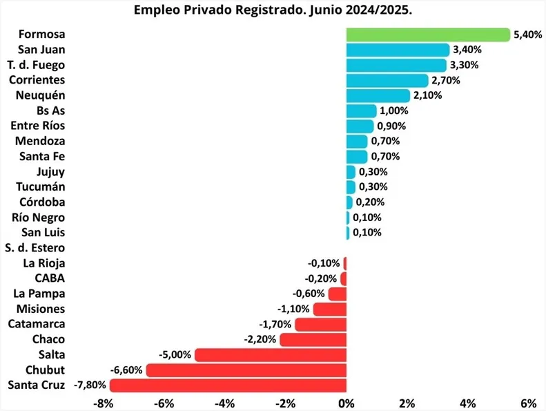 Por otro lado, remarcaron que una situación es totalmente distinta en la provincia de Formosa, debido a que tuvo un crecimiento del 5,40% en junio del 2025 en su comparación interanual, siendo de esta forma la jurisdicción del país que mayor crecimiento obtuvo en empleo privado registrado, incorporando más de 1185 trabajadores registrados en el sector en el último año.