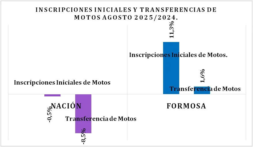 Además, en lo que respecta a las transferencias de motos en la provincia de Formosa en agosto del 2025, en la comparación interanual, también hubo un crecimiento del 1,6%, siendo también la jurisdicción norteña la de mayor crecimiento, subrayaron.