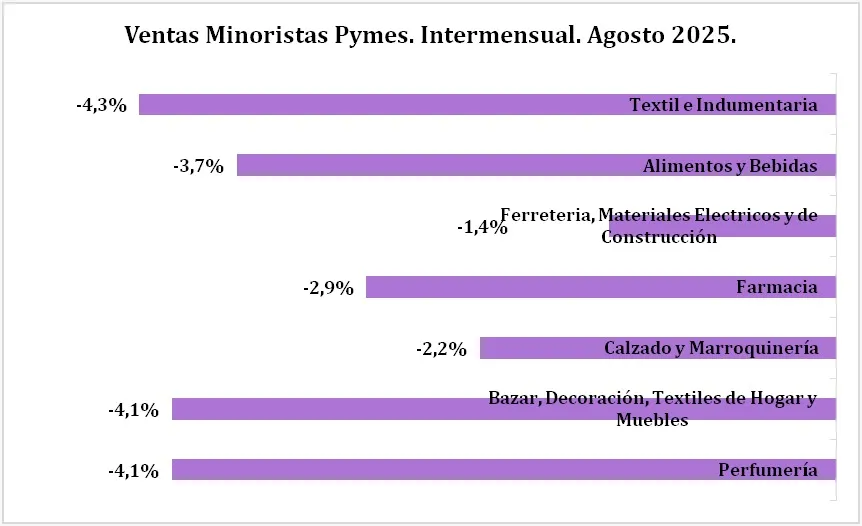 En lo que son las ventas minoristas pymes por rubro, consignaron que la totalidad de las mismas tuvieron caídas intermensuales, en donde el rubro de mayor caída fue “textil e indumentaria” con el 4,3%.