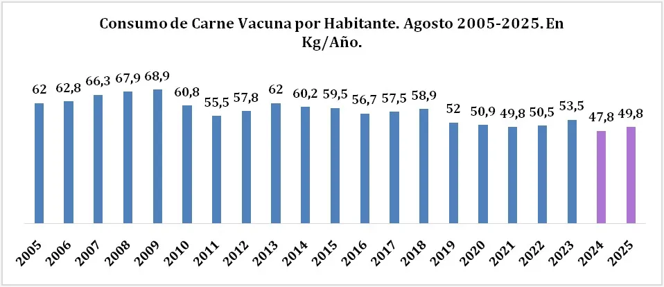 Del mismo modo, en la serie del consumo de carne vacuna por habitante desde 2005 al 2025, para agosto de cada año, se visualiza que el de este año sigue siendo uno de los más bajo de la serie, puntualizaron.
