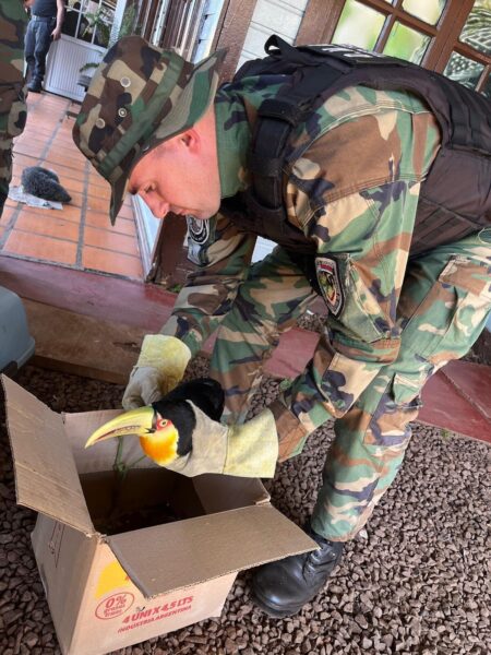 La Policía de Misiones, a través de la División Defensa del Medio Ambiente y Delitos Rurales de San Vicente, rescató este miércoles en una vivienda de El Soberbio a un ejemplar de tucán pico verde (Ramphastos dicolorus) que presentaba lesiones y necesitaba atención veterinaria.