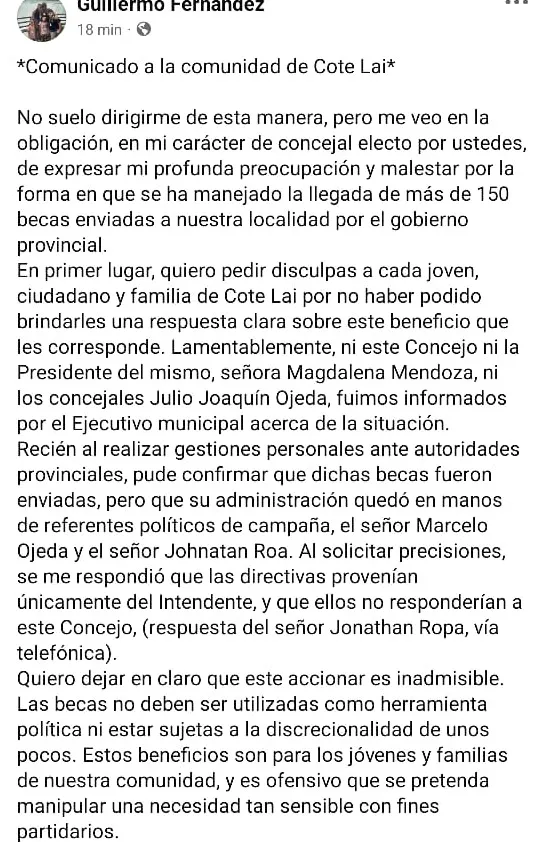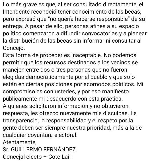 Se difundió por redes la denuncia de un concejal electo de la UCR en Cote Lai, Guillermo Fernández, que acusa al gobierno de Leandro Zdero de “canjear becas por votos” para candidatos aliados a La Libertad Avanza. La publicación habla de pagos de $50.000 a jóvenes y de la intervención de punteros en la entrega de becas y cajas del programa Ñachec. No hubo respuesta oficial hasta el momento.