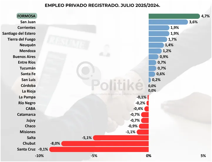 Por otro lado, hicieron notar que “una situación totalmente distinta se da en la provincia de Formosa debido a que tuvo un crecimiento del 4,70% en julio del 2025 en su comparación interanual, siendo de esta forma la jurisdicción del país que mayor crecimiento obtuvo en empleo privado registrado, incorporando más de 1028 trabajadores registrados en el sector en el último año”.