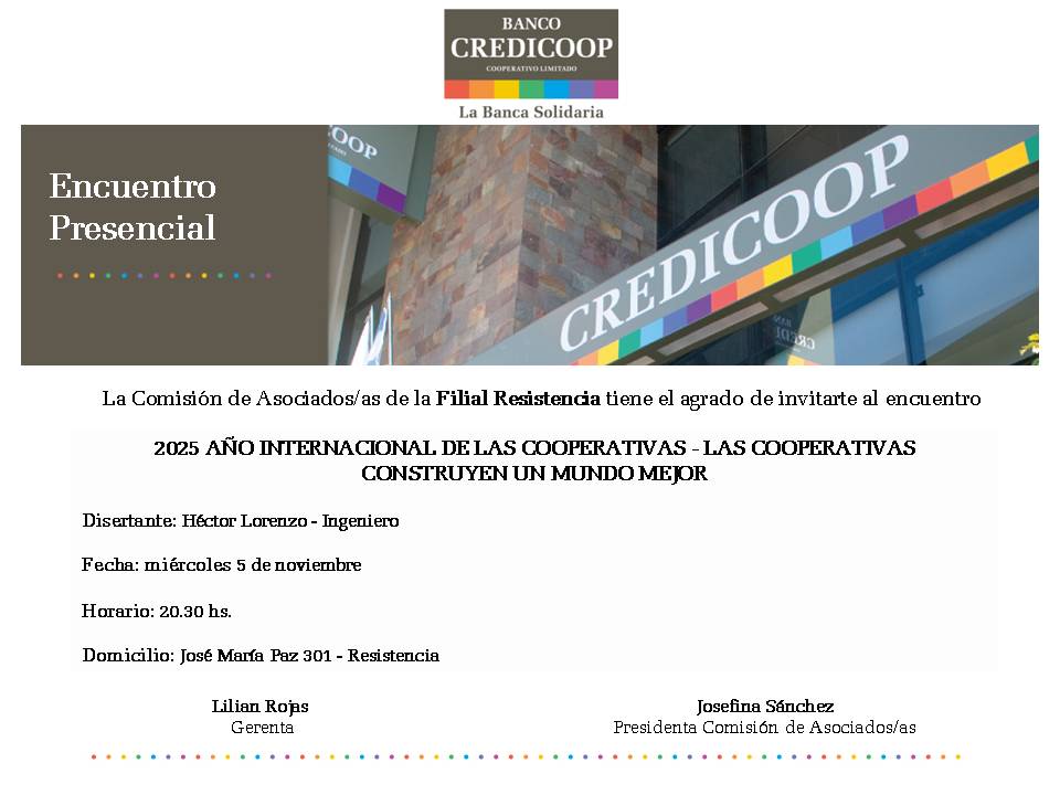 La Comisión de Asociados/as de la Filial Resistencia del Banco Credicoop invita al encuentro “2025 Año Internacional de las Cooperativas – Las cooperativas construyen un mundo mejor”, que se realizará el miércoles 5 de noviembre, a las 20.30, en José María Paz 301, Resistencia. La disertación estará a cargo del ingeniero Héctor Lorenzo. La actividad es abierta, con cupos limitados hasta completar la sala.
