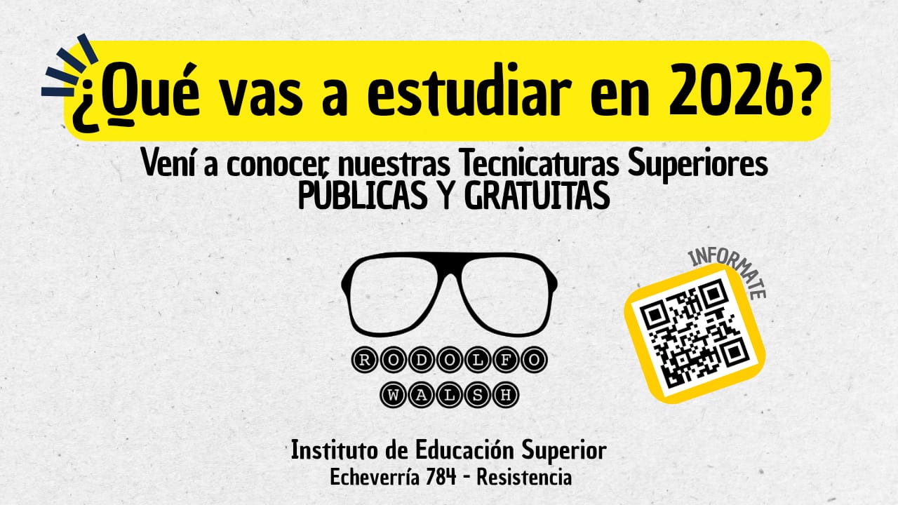 El Instituto de Educación Superior “Rodolfo Walsh” realizará su Muestra Anual de Educación Técnico Profesional este viernes 14 de noviembre, de 19 a 23, en su sede de Echeverría 784, Resistencia. Habrá exposiciones de cada tecnicatura, muestras de trabajos, transmisiones de streaming y talleres abiertos.