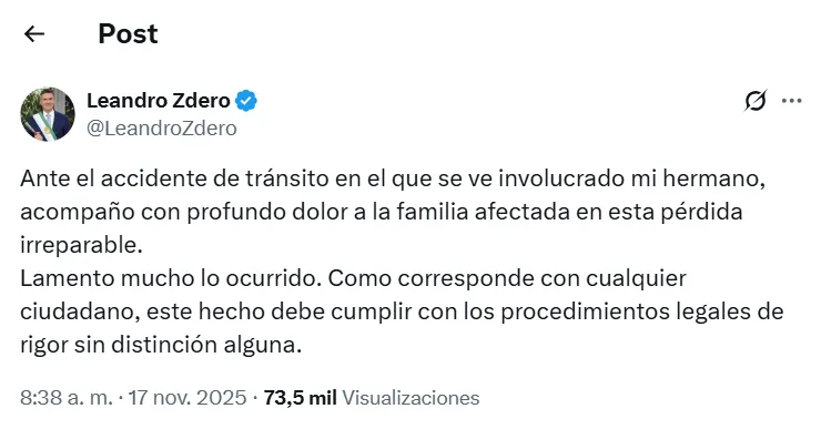 La primera declaración explícita del gobernador llegó el lunes 17 de noviembre, casi dos días después del choque. Desde su cuenta en X, Zdero escribió: