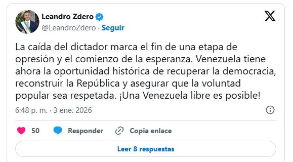 Zdero publicó en X: “La caída del dictador marca el fin de una etapa de opresión y el comienzo de la esperanza… ¡Una Venezuela libre es posible!”, en sintonía con el clima de festejo del oficialismo libertario en Argentina.El problema no es condenar una dictadura: es aplaudir una intervención armada como si fuera un trámite limpio y sin consecuencias. En política exterior, la forma importa tanto como el fondo, porque lo que se legitima hoy termina volviendo mañana con otro objetivo y otro “enemigo”.