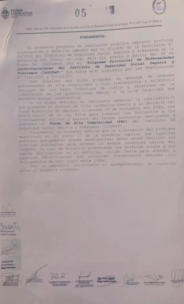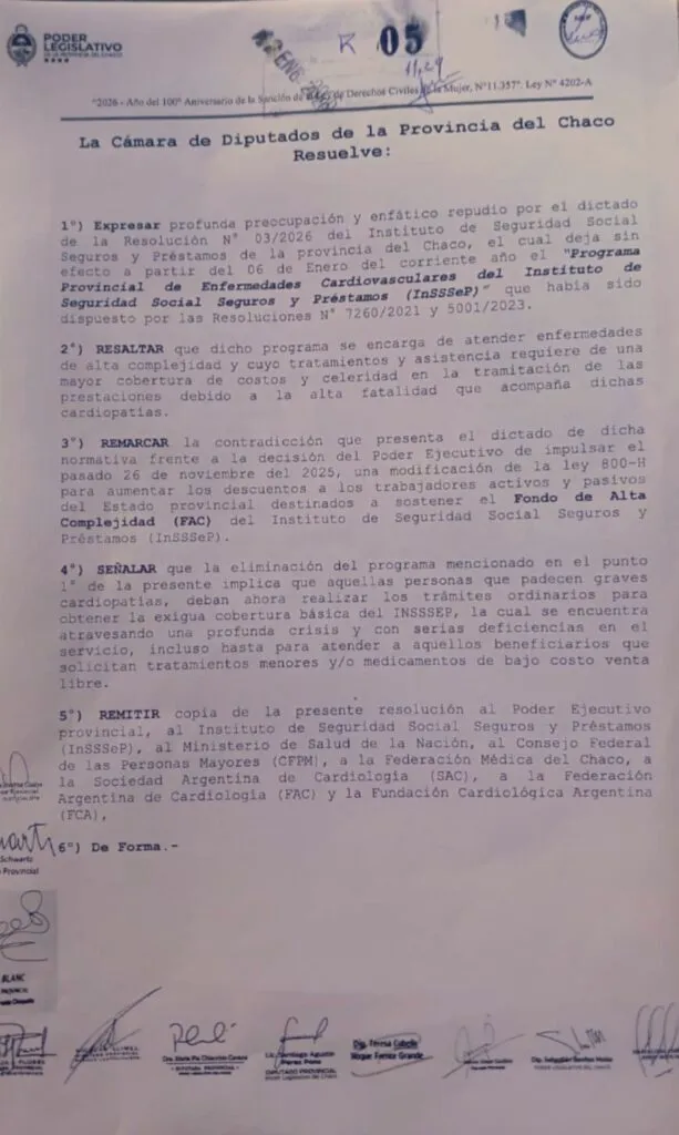 El proyecto, identificado con el número 5, fue presentado este lunes 12 en la Cámara de Diputados del Chaco y cuestiona la decisión adoptada por el organismo a través de la Resolución N.º 03/2026, vigente desde el 6 de enero de este año. La medida deja sin efecto un programa estratégico creado por las Resoluciones N.º 7260/2021 y 5001/2023, destinado a garantizar mayor cobertura, celeridad administrativa y acompañamiento integral a pacientes con cardiopatías de alta complejidad, cuyos tratamientos implican elevados costos y riesgos vitales.