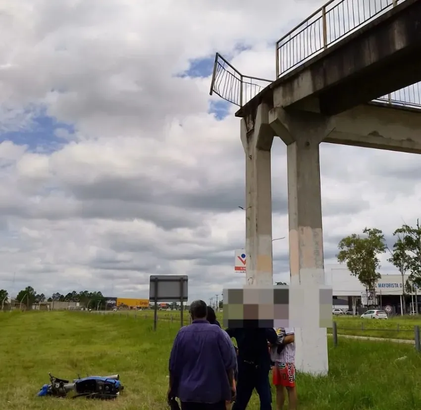 Según reconstrucciones publicadas por medios locales, el conductor circulaba por el tramo ascendente de la pasarela cuando impactó contra la baranda de seguridad y cayó junto con la moto desde una altura aproximada de cinco metros. Al llegar los efectivos, el hombre se encontraba inconsciente y fue trasladado en una ambulancia (interno 6828) al centro de salud para estudios y atención médica.