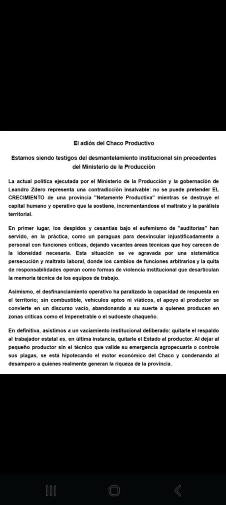 Durante la manifestación, el secretario general de ATE Chaco, Isaac Chaparro, fue contundente al describir el impacto social de las medidas adoptadas por la gestión de Zdero. “Cuando le sacan el salario a un trabajador, se lo sacan a sus hijos. Esto es un atropello a las familias”, afirmó, al tiempo que advirtió que el recorte no se detiene en un solo organismo. “Hoy le toca a Producción, mañana será otro sector. Si nos quedamos con los brazos cruzados, esto avanza”, alertó.