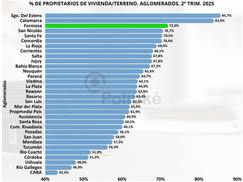 Desde la consultora Politiké explicaron que en dicho relevamiento de los aglomerados se puede apreciar que, en Formosa, durante el segundo trimestre del 2025, el 72% de las viviendas y terrenos son propiedad de las personas que viven en ellas, superando el promedio nacional del 61,9%. De esta manera, se ubicó como el tercer aglomerado del país y del Norte Grande y primero del NEA en cuanto a propiedad de la vivienda y terreno donde viven las familias.