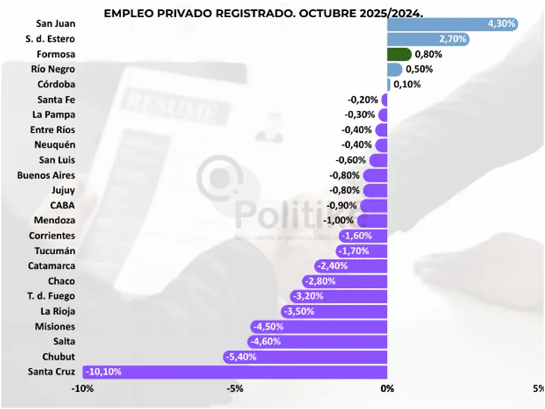 Por otro lado, a pesar del desalentador escenario que está viviendo el país, Formosa se encuentra dentro de las pocas provincias de las cuales han tenido una mejora en la generación de empleo privado. Muestra una variación positiva interanual del 0,8% respecto del año pasado, resaltó la consultora.