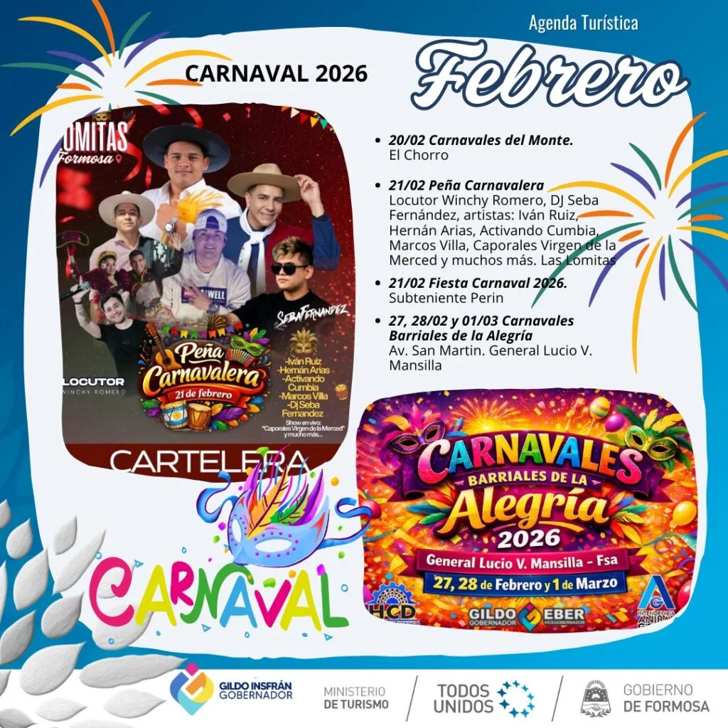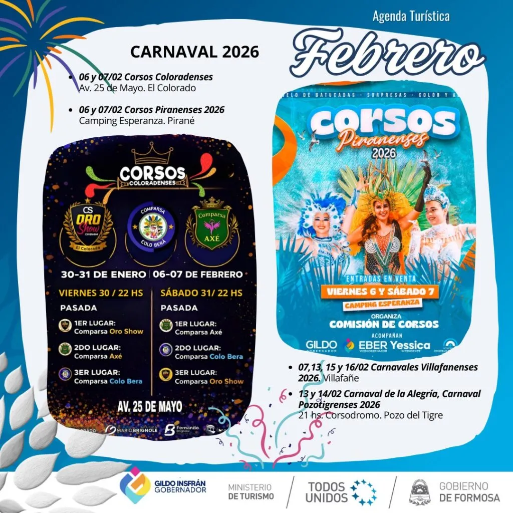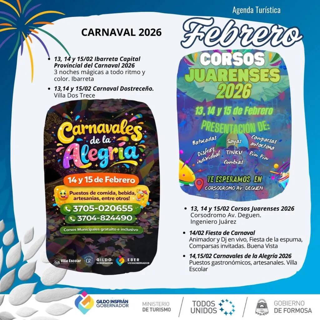 El Ministerio de Turismo de Formosa dio a conocer la agenda oficial de corsos y carnavales que se desarrollarán durante febrero y comienzos de marzo en distintas localidades de la provincia, con propuestas culturales, artísticas y recreativas para disfrutar en familia y con amigos.