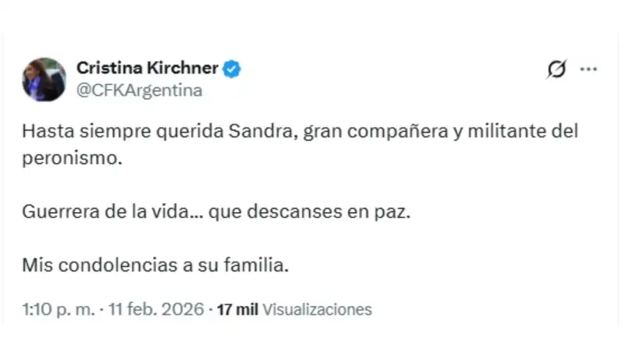 Por su parte, la expresidenta Cristina Fernández de Kirchner utilizó sus redes sociales para dedicarle un emotivo mensaje: “Hasta siempre querida Sandra, gran compañera y militante del peronismo. Guerrera de la vida... que descanses en paz. Mis condolencias a su familia”, expresó CFK a través de su cuenta de X.