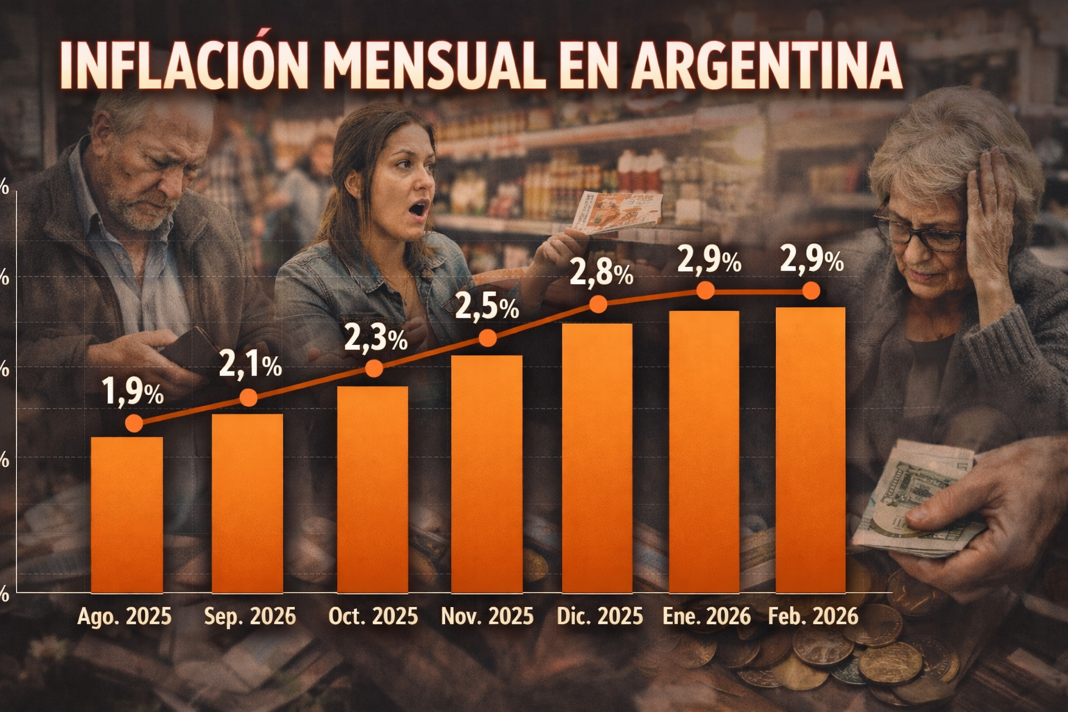 La lectura de la serie reciente tampoco ayuda al optimismo oficial. Desde agosto de 2025, cuando el IPC nacional había marcado 1,9%, la inflación mensual fue subiendo casi sin interrupciones: 2,1% en septiembre, 2,3% en octubre, 2,5% en noviembre, 2,8% en diciembre, 2,9% en enero y nuevamente 2,9% en febrero. Más que una baja sostenida, lo que muestran los números es un proceso que se frenó y volvió a estabilizarse en niveles todavía altos para una economía que sigue bajo ajuste.