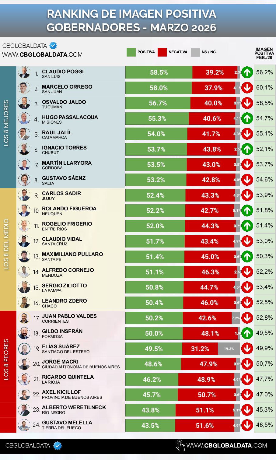 Aunque ambos mandatarios conservaron saldo positivo, el retroceso de marzo los empujó hacia la mitad baja de la tabla nacional. No se trata todavía de un derrumbe, pero sí de una señal de desgaste en dos provincias donde el humor social viene atravesado por problemas económicos, pérdida de poder adquisitivo, conflictos sectoriales y demandas de gestión que no encuentran respuesta solo con discurso.
