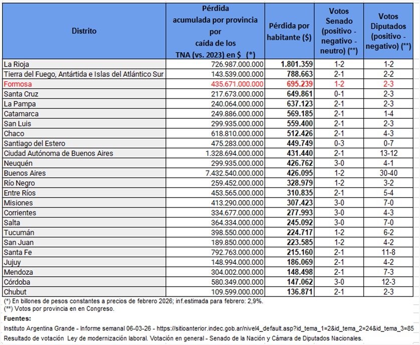 Un trabajo realizado por el Instituto Argentina Grande refleja la pérdida acumulada por cada provincia al comparar los montos efectivamente recibidos entre el período comprendido entre enero de 2024 y febrero de 2026 respecto a los recibidos en 2023.