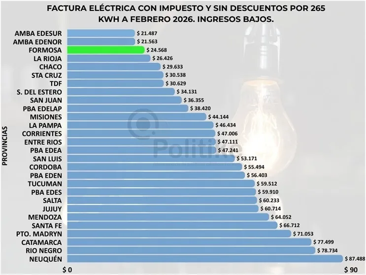 Al desglosar los datos por provincia, se observa que Formosa es una de las jurisdicciones del país con la factura eléctrica más baja para ingresos bajos, con valores de $24568 (N2), a valores de febrero de 2026.