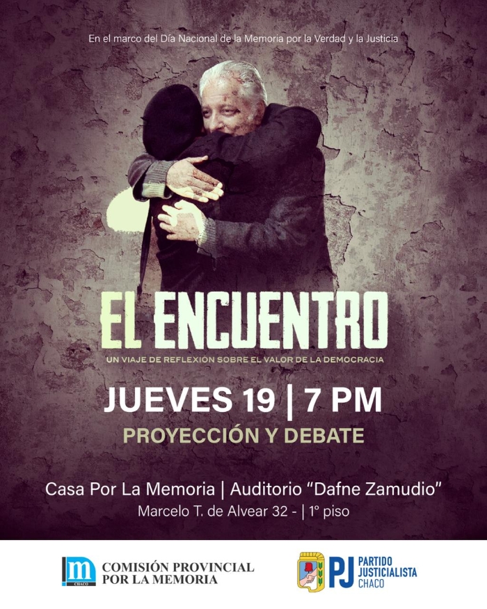 En el marco de las actividades por los 50 años del golpe de Estado, el jueves 19 de marzo a las 19 se realizará la proyección del documental El Encuentro, dirigido por Pablo Deltin, en la Casa por la Memoria, Auditorio “Dafne Zamudio”, ubicado en Marcelo T. de Alvear 32, 1° piso, en la ciudad de Resistencia.