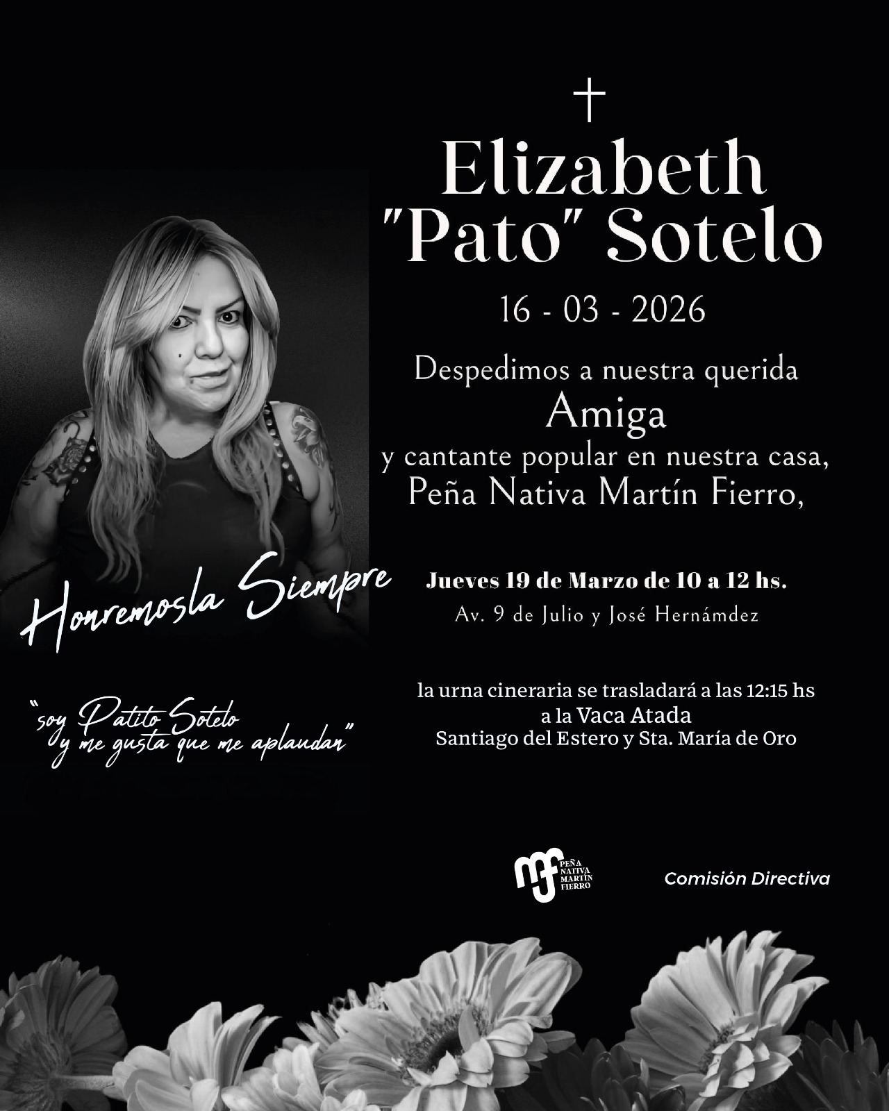 La cantante chaqueña Elizabeth “Pato” Sotelo será velada este jueves 19 de marzo, de 10 a 12, en la Peña Nativa Martín Fierro, en la esquina de avenida 9 de Julio y José Hernández, en Resistencia. La convocatoria al último adiós comenzó a circular entre artistas, allegados y medios locales pocas horas después de confirmarse su fallecimiento, ocurrido tras un largo tratamiento médico en Buenos Aires.