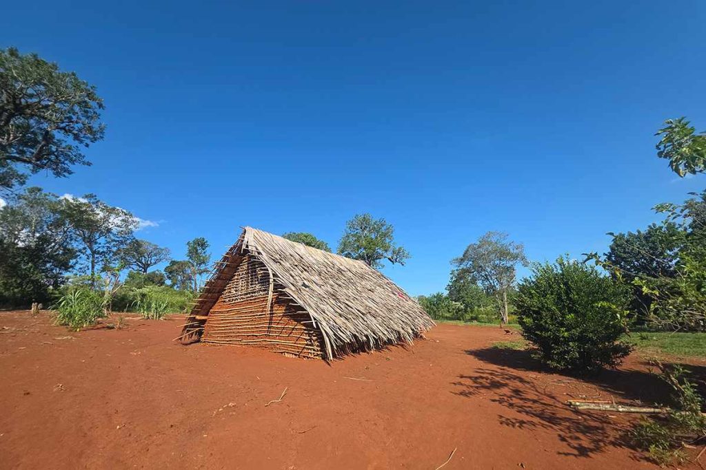 En medio de esta espesura, se dispersan las viviendas de las familias que pueblan Jejy. Son construcciones hechas con barro, tacuaras, lianas de selva y coberturas de hojas de palmera pindó que se entrelazan formando un techo fresco e impermeable.