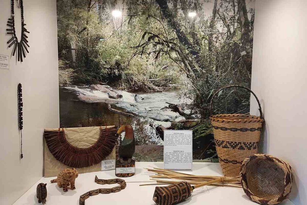 Además, la abuela es artesana, especializada principalmente en la cestería. Su sabiduría en la materia se traslada de generación en generación, especialmente a mujeres. “Los canastos se tejen con fibras de takuapi, tacuaras que se encuentran en el monte; y se pintan en base a tinta hecha con corteza de katigua”, traduce Hugo. Los símbolos y tramas que se plasman en los diseños de la cestería Mbya Guaraní están intrínsecamente ligados a la espiritualidad indígena.