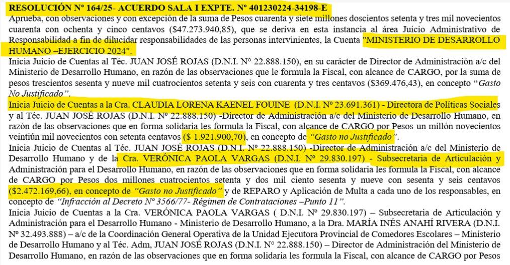 Dentro de esa misma resolución, el organismo abrió distintos juicios de cuentas por gastos no justificados, documentación faltante y reparos con multas. Entre los montos observados figuran $369.476,43 contra Juan José Rojas; $1.921.900,70 contra Claudia Lorena Kaenel Fouine y el propio Rojas; y $2.472.169,66 contra Rojas y Verónica Paola Vargas, junto con un reparo con multa por presuntas infracciones al régimen de contrataciones.