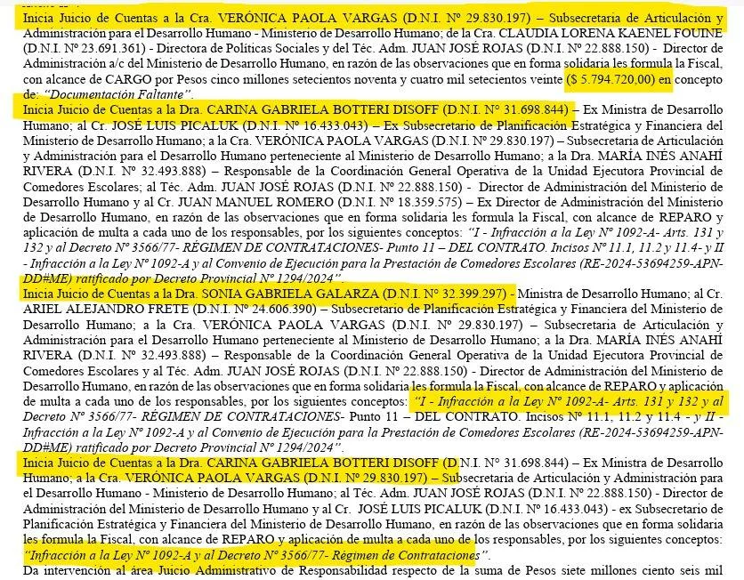 El expediente también incluye actuaciones vinculadas a comedores escolares, un punto especialmente sensible dentro de la cartera social. En ese tramo aparecen observaciones sobre expedientes que involucraron a Verónica Paola Vargas, María Inés Anahí Rivera y Juan José Rojas, entre otros funcionarios alcanzados por las actuaciones del Tribunal.