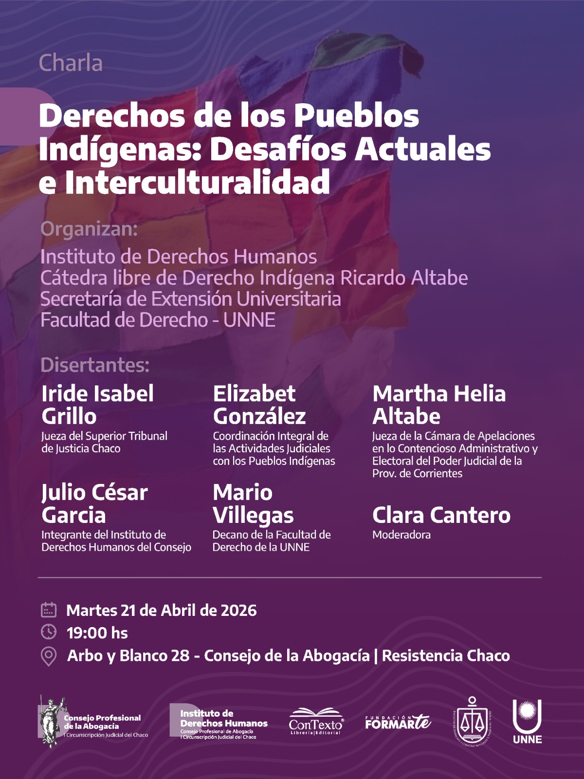 La ciudad de Resistencia será sede este martes 21 de abril, desde las 19, de la charla “Derechos de los Pueblos Indígenas: Desafíos Actuales e Interculturalidad”, una actividad presencial que se realizará en el Consejo de la Abogacía, en Arbo y Blanco 28. La convocatoria fue difundida por la Facultad de Derecho de la UNNE dentro de su agenda oficial de eventos.