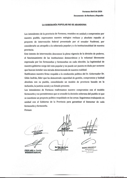 En el documento titulado “La soberanía popular no se abandona”, emitido este sábado 25, los intendentes formoseños hacen saber que, “reunidos en unidad y compromiso por nuestro pueblo, expresamos nuestro enérgico rechazo y absoluto repudio al proyecto de intervención federal presentado por el senador por la minoría Francisco Paoltroni”.